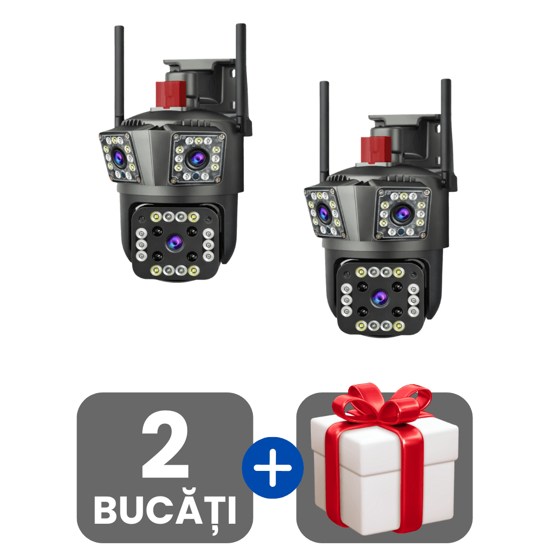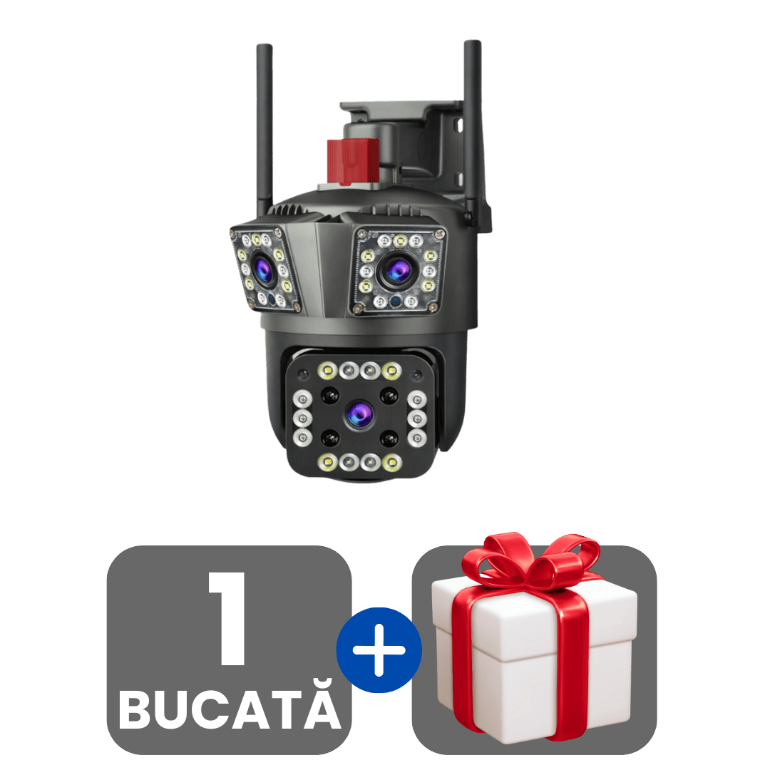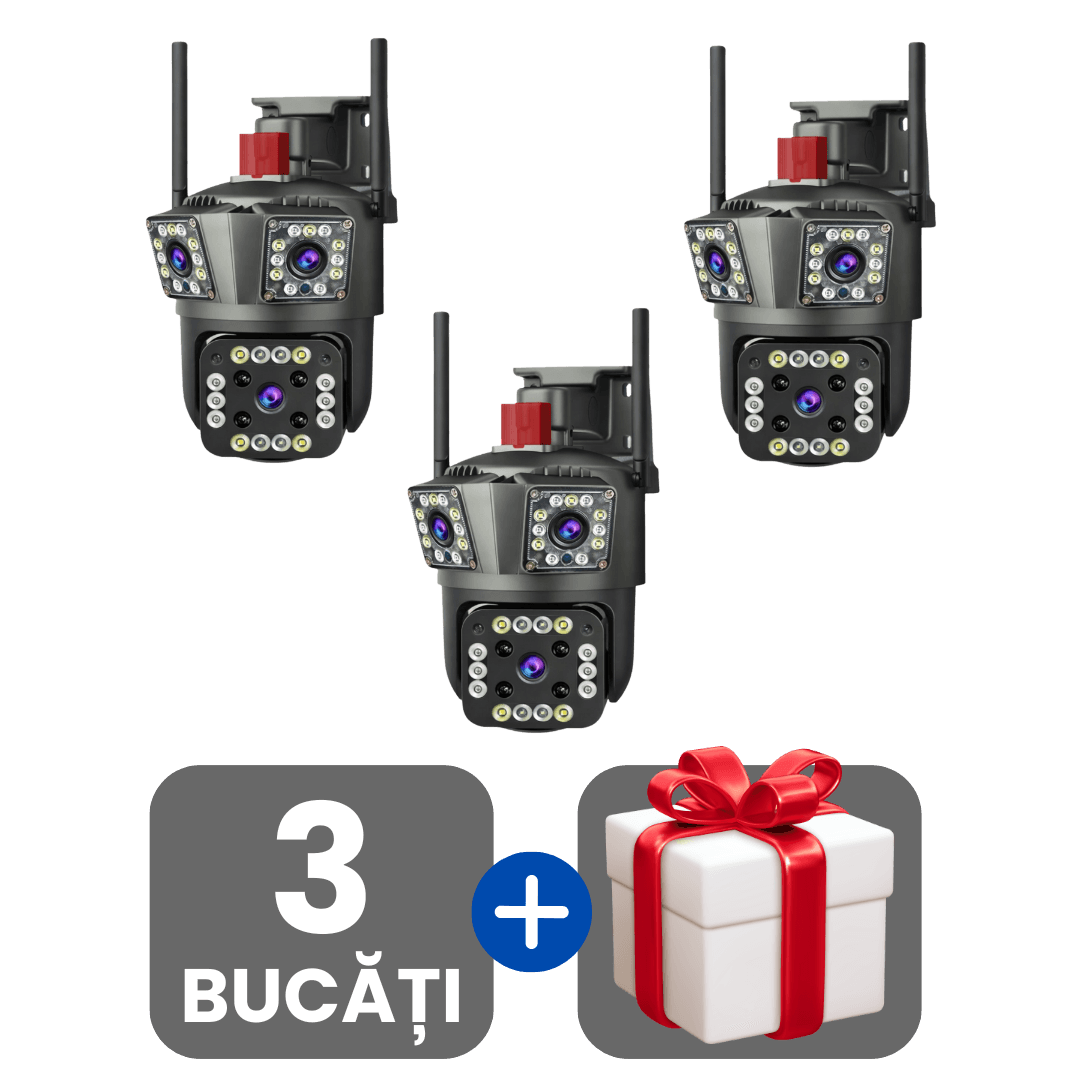 În timp ce pe piață există multe modele, camera noastră este 100% originală și oferă trei lentile reale. Ai 3 camere într-una singură și vezi simultan mai multe unghiuri, ca să acoperi toate colțurile din curte fără zone oarbe.