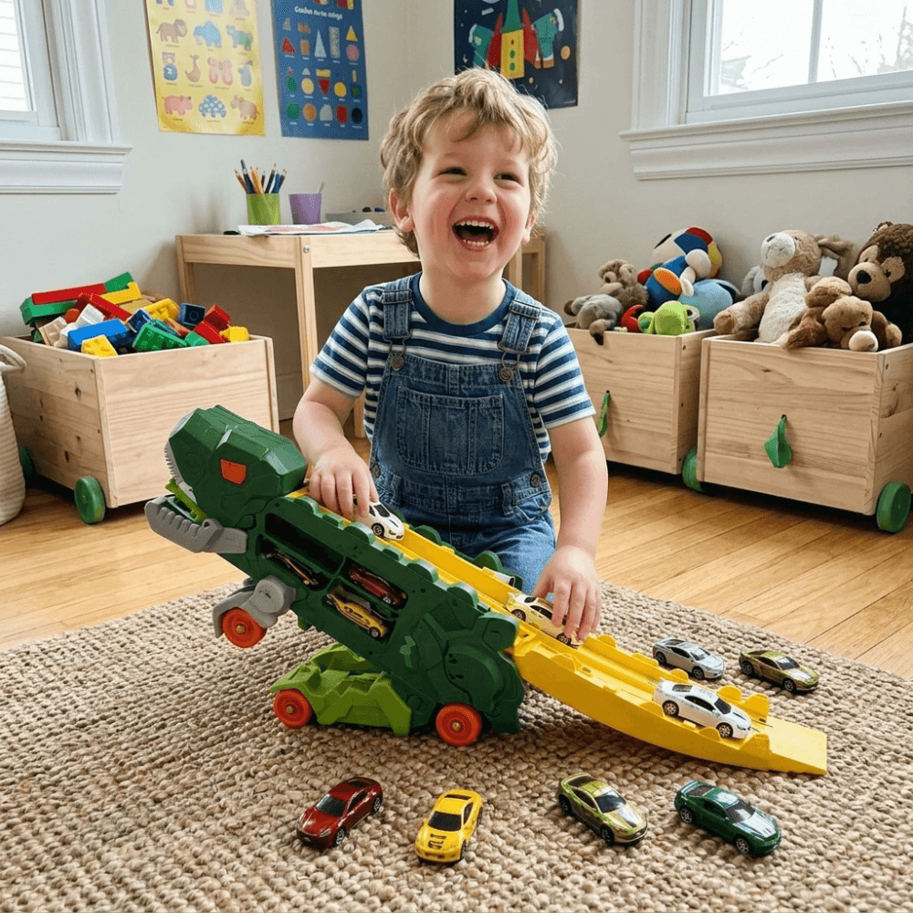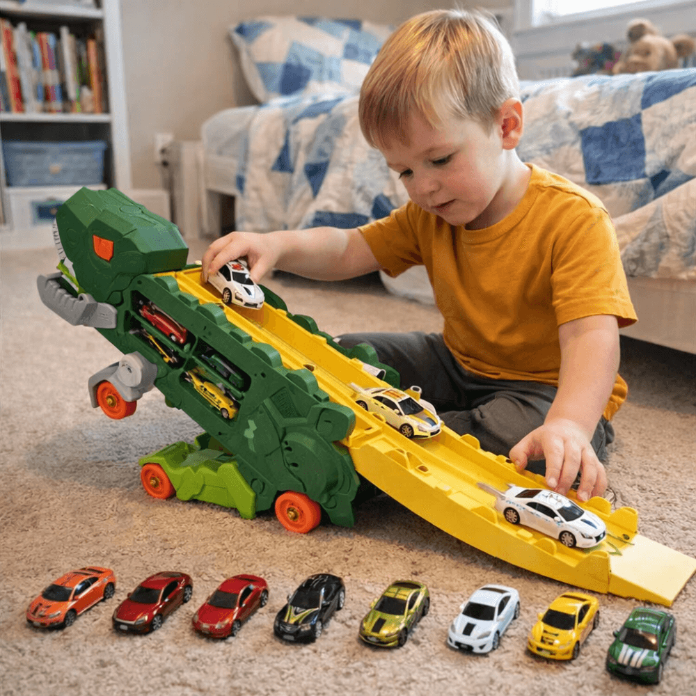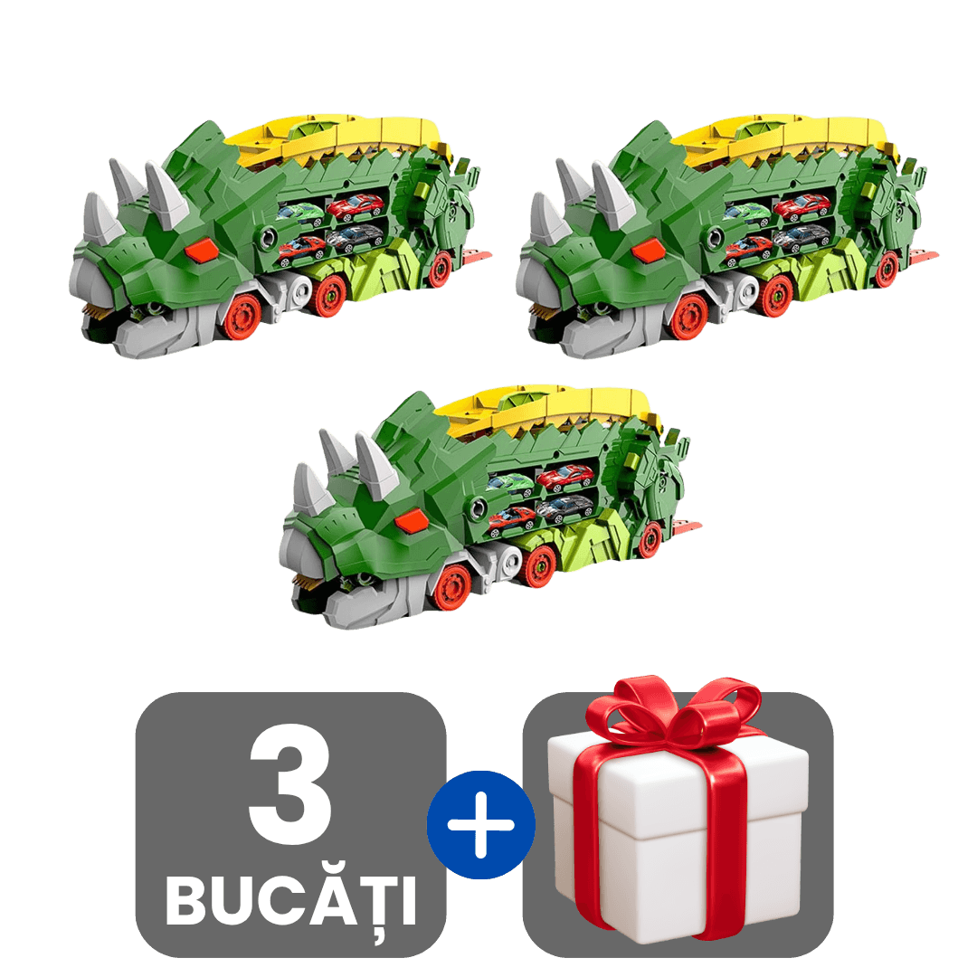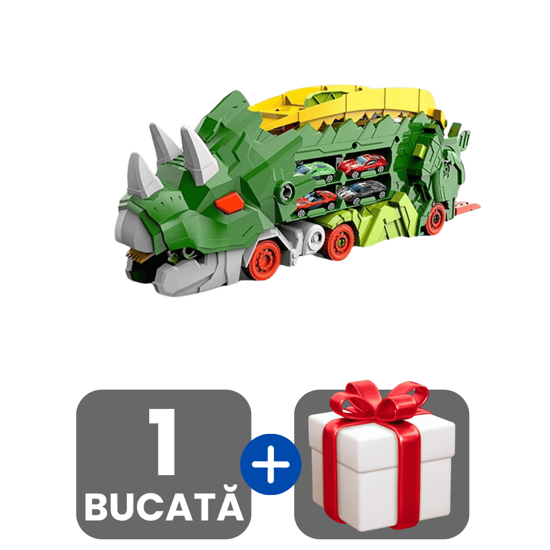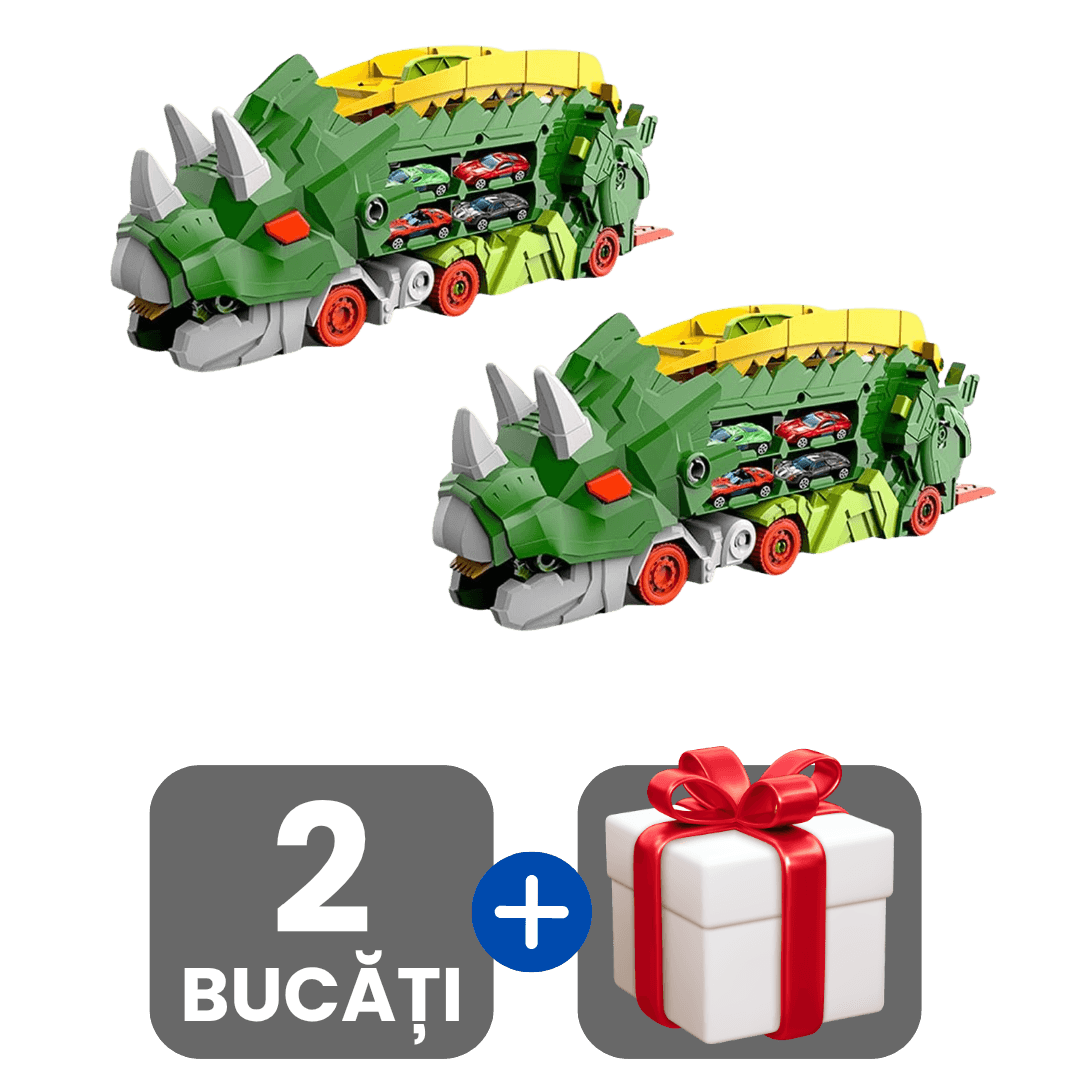 Jucărie Interactivă Dinozaur 2-în-1 cu Camion, Rampă de Lansare și 2 Mașinuțe + Cadou surpriză 🎁