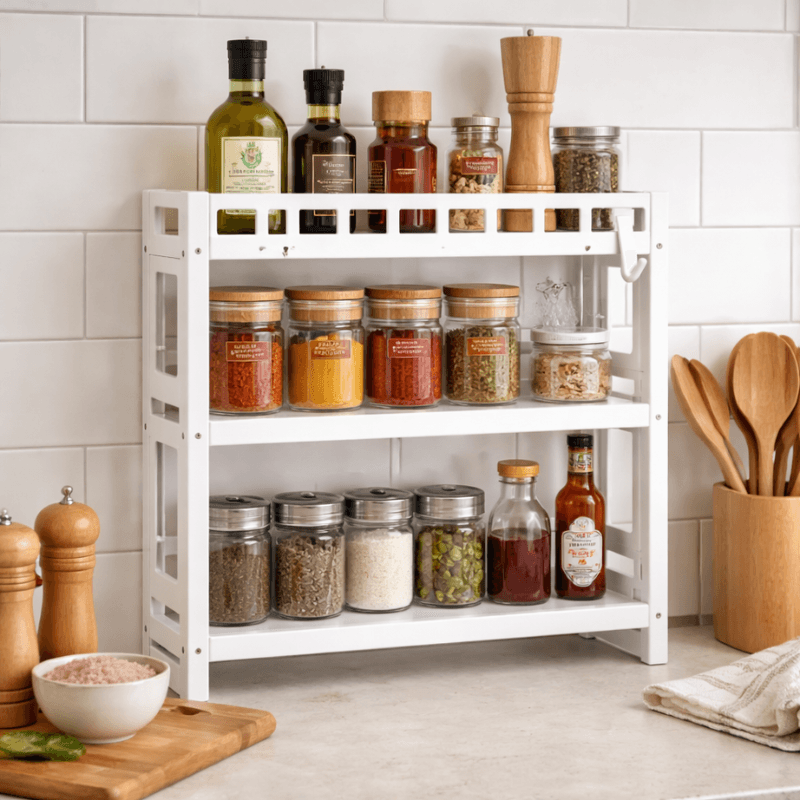 - Trei nivele practice: organizează cosmetice sau condimente, economisind spațiu pe blat sau perete.